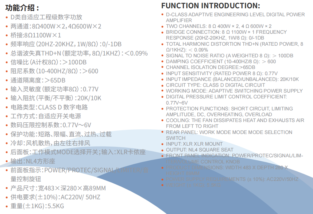 兩通(tōng)道(dào):8Ω400W×2,4Ω600W×2